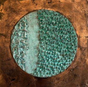 Technik: Objektbild aus Keramik, Schlagmetall, Pigmente auf Holz und Leinwand
